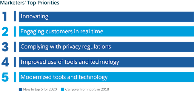 A Salesforce kutatásában résztvevő marketingvezetők az ezzel kapcsolatos innovációt az egyik legjelentősebb prioritásaként nevezték meg a valós idejű ügyfél-elkötelezettség elérése érdekében. Úgy vélik, hogy a marketing és az informatika szimbiózisa most, a koronavírus-járvány idején és az azt követő időszakban fontosabb, mint eddig valaha volt. A digitális átalakulás iránti nyitottság az üzleti siker kritikus része lesz az elkövetkező években.